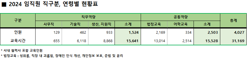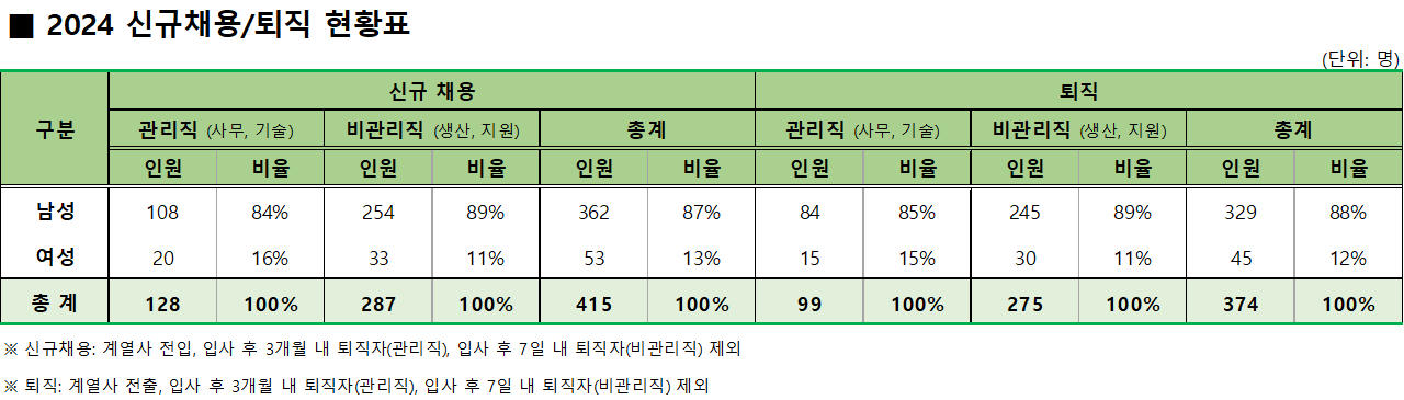 2024년 기준 퇴직자는 총 374명으로, 전원 자발적 퇴사로 구성되었으며, 대부분은 경력 전환이나 개인 사유 중심의 자연스러운 이직 유형으로 나타났습니다. 이직 추이를 바탕으로 퇴사 사유 분석과 재직 기간 모니터링을 통해 조기 퇴사 예방 및 정착률 제고 전략을 지속 추진하고 있으며, 입문교육 강화, 복리후생 제도 확대 등 다각적인 인력 유지 정책을 통해 조직의 안정성을 높여가고 있습니다.