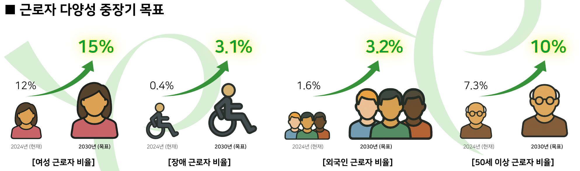 또한, 코리아써키트는 여성, 장애인, 외국인 등 다양한 배경을 가진 인재들이 공정한 기회를 부여 받고 역량을 발휘할 수 있도록 중장기 다양성 확대 목표를 설정하고 있습니다. 2030년까지 여성 관리자 비율을 점진적으로 확대하고, 장애인 근로자에 대한 안정적 고용 유지와 외국인 근로자의 차별 없는 근무 환경 조성을 위한 정책적 노력을 지속하고 있습니다. 이를 위해 채용 정책 개선, 내부 교육 강화, 조직 문화 개선 등 실질적인 제도 운영을 병행하고 있으며, 글로벌 기준에 부합하는 다양성과 포용 기반의 인사 전략을 지속 추진해 나갈 계획입니다.